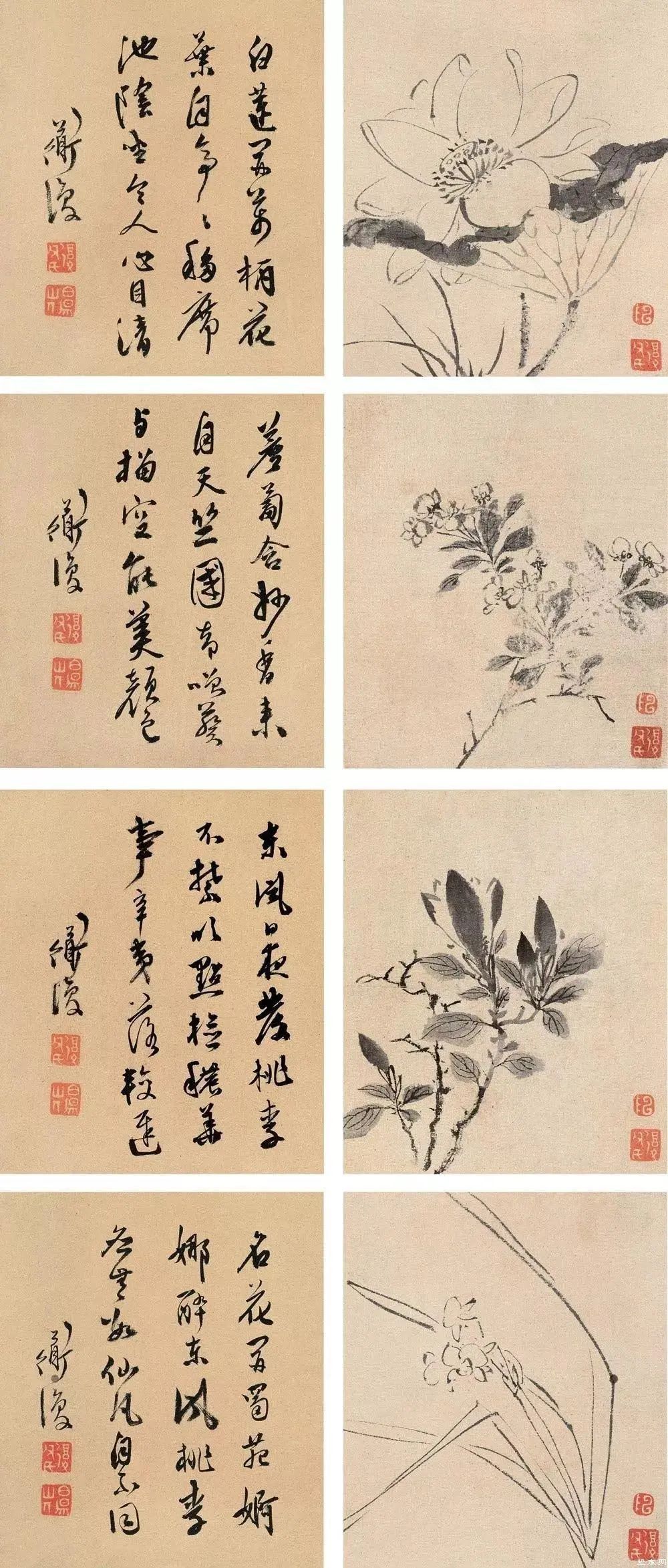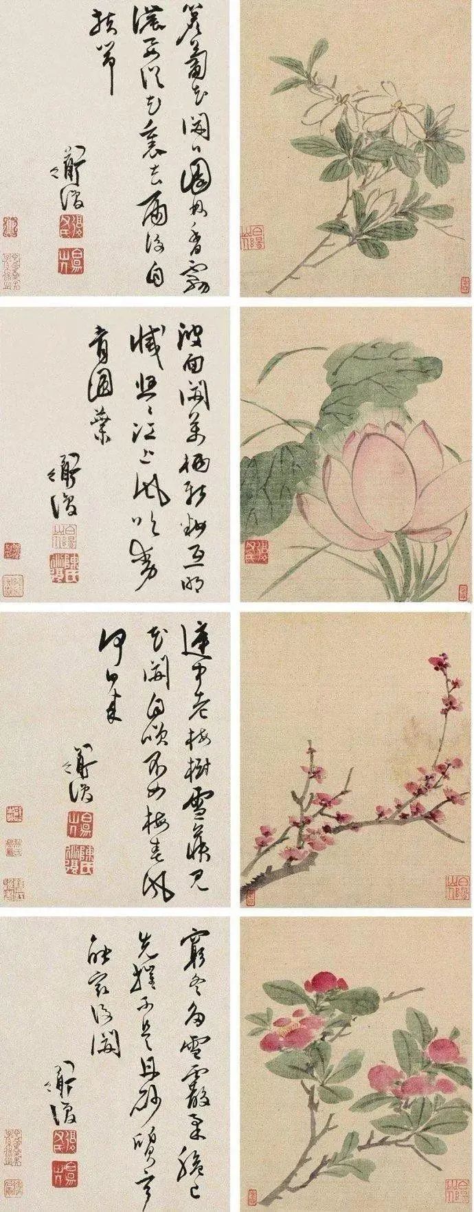 陈淳的花鸟画作品众多,每一幅都充满了艺术魅力和感染力。例如,他的《红梨诗画图》《山茶水仙图》《葵石图》等作品,都以简洁明快的笔墨,生动地表现出花鸟的神韵和生命力。他的用笔灵动自如,墨色浓淡相宜,画面充满了生机和活力。这些作品不仅展示了陈淳高超的绘画技艺,也体现了他的艺术追求和审美理念。